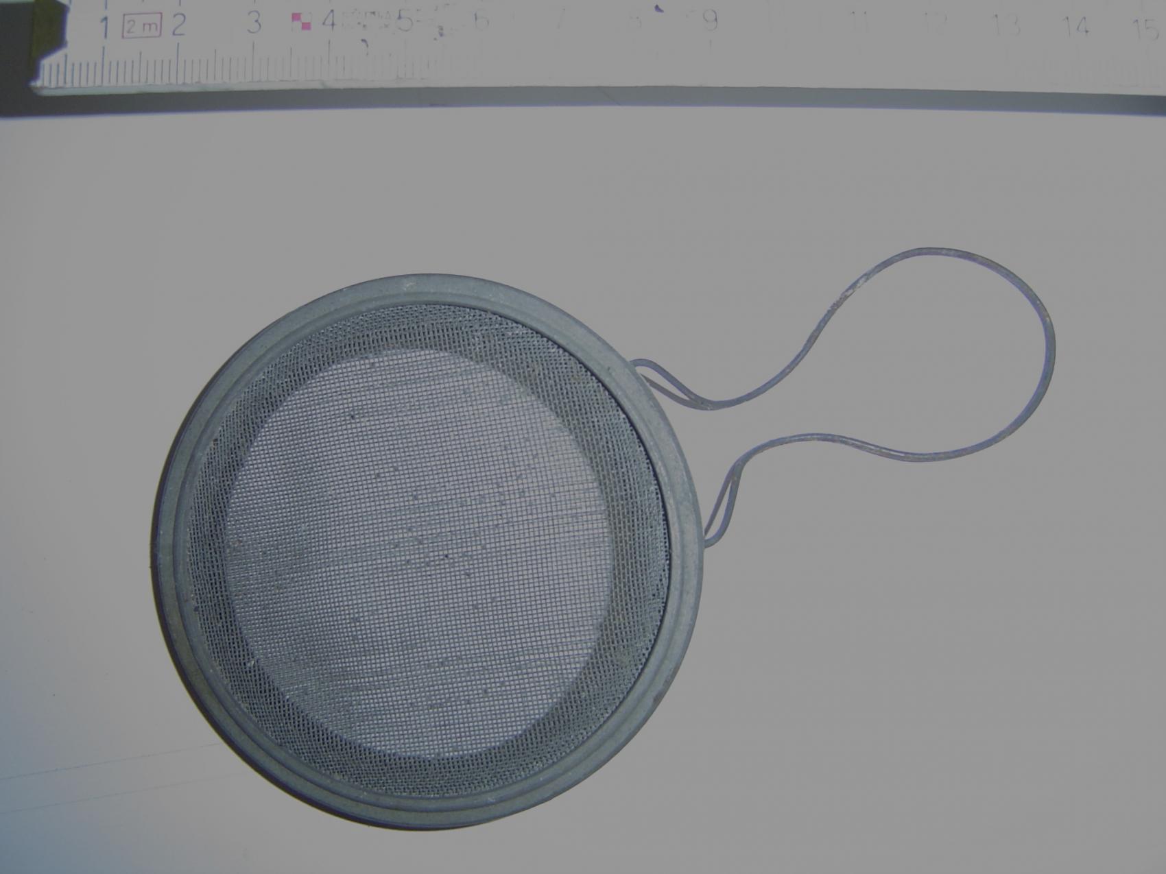 es handelt sich um einen metallenen, schwach magnetischen Ring Durchmesser 8 cm, an dem ein Sieb und ein relativ fragiler Drahthalter befestigt ist. An der Oberseite des Rings gibts noch 4 Vertiefungen und eine mit viel Fantasie zu entziffernde erhabene Markierung.