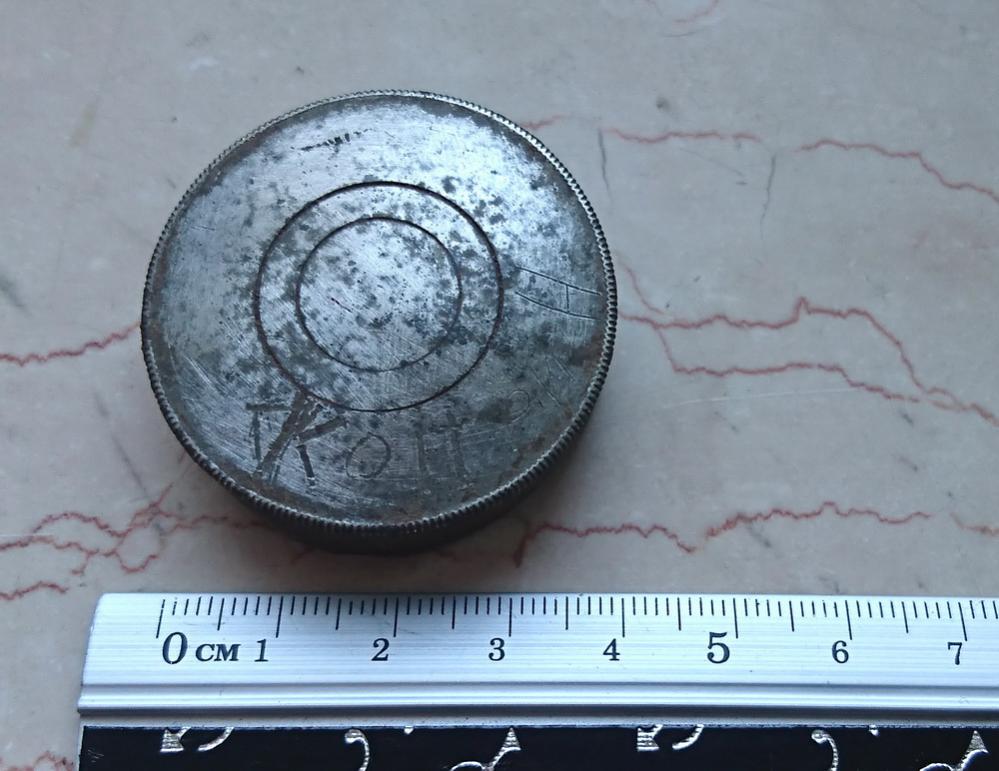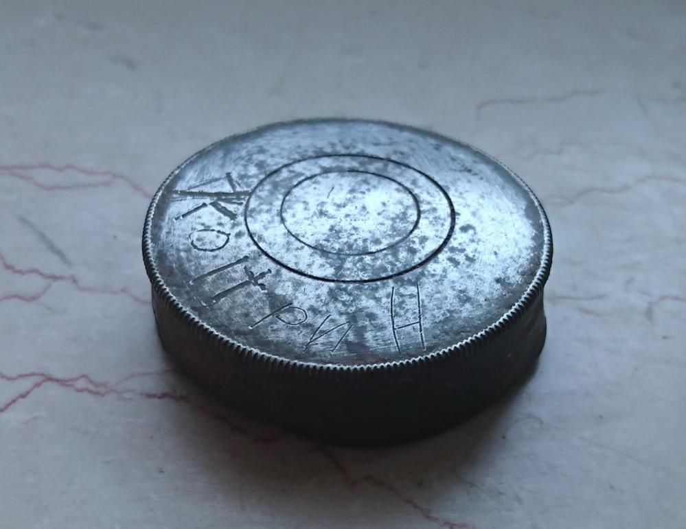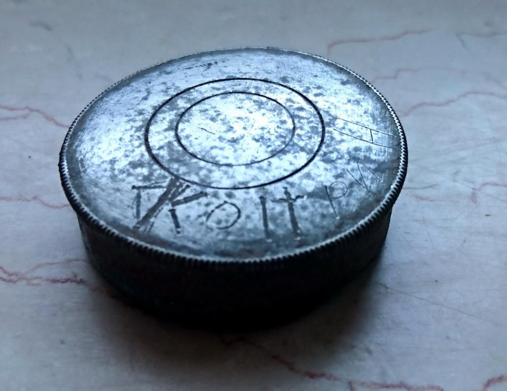 Gestern habe ich in der Wald bei Saarbrücken diese Kappe (?) gefunden. Mit Handbeschriftung. Erste Buchstaben sind KOIT oder KOH. Die drei letzte Buchstaben sind wahrscheinlich kyrillisch "РИН".