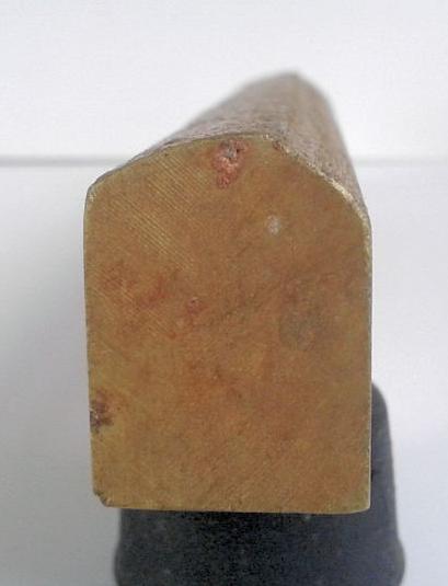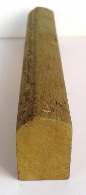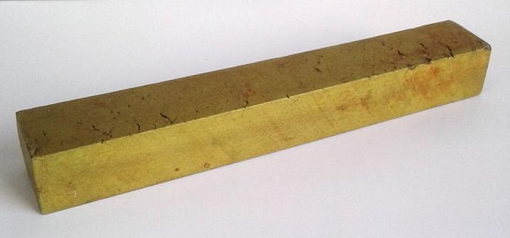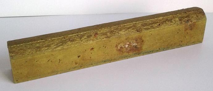 Ein Alublock,gelb eloxiert,15,5 cm x 2 cm x 2,7 cm,obere Fläche scheint vor der Eloxierung grob angeschliffen worden zu sein.Auf Bild 1. ist unten ein schwacher grüner Oxidschatten sichtbar.Der Block könnte mal einen flachen Messing-,oder Kupfersockel gehabt haben.
