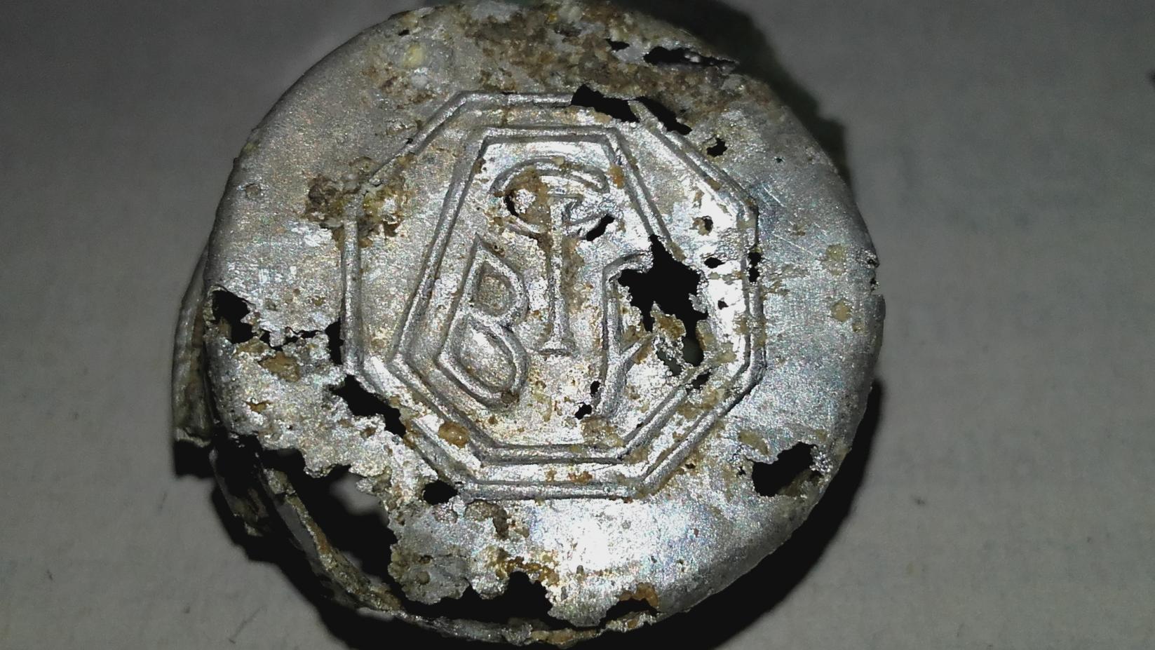 Ein Achteck mit einem B und einem A (oder F), oben ein kleines C wies ausschaut? Keine Ahnung, vielleicht hat jemand solch einen Verschluss schon mal gesehen. Ist ziemlich klein, Durchmesser 2 cm, 9 mm hoch.