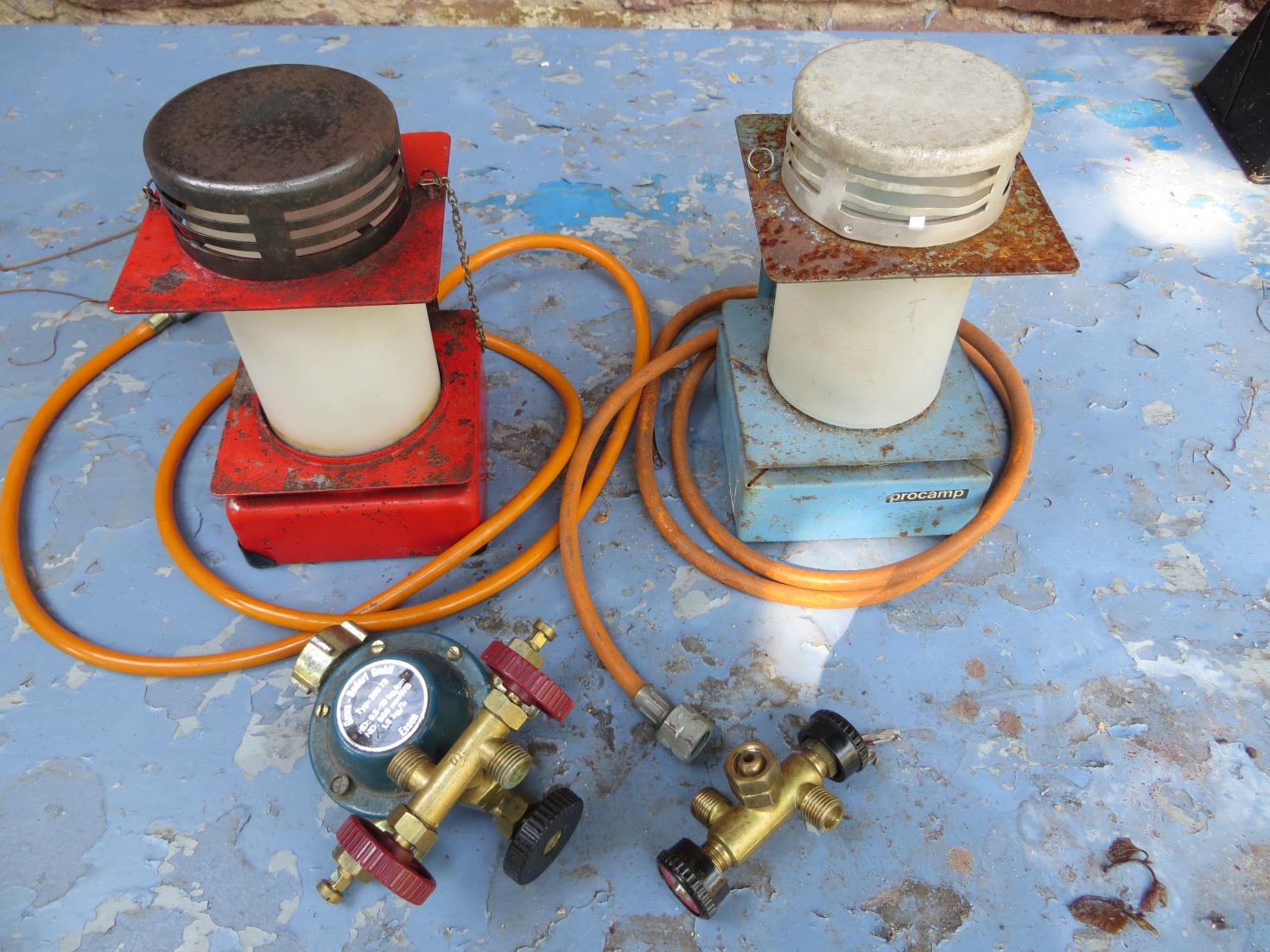 2 Gaslampen, die man mit dem Schlauch an ne Gasflasche anschließen kann. Zum am Kettchen abhängen oder an die Wand schrauben. Auf der einen steht "procamp" - auf der anderen -baugleichen- stand mal vorm Transport