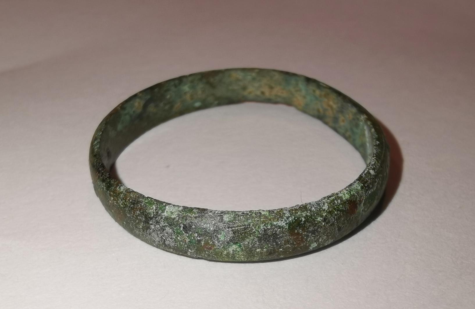 Es ist Bronze. Ohne Fundkontext kaum zu datieren, findet man aber gelegentlich im Zusammenhang mit früher Eisenzeit. Bronzezeitlich sind sie fast immer verziert, dann meist Kerbschnitt.