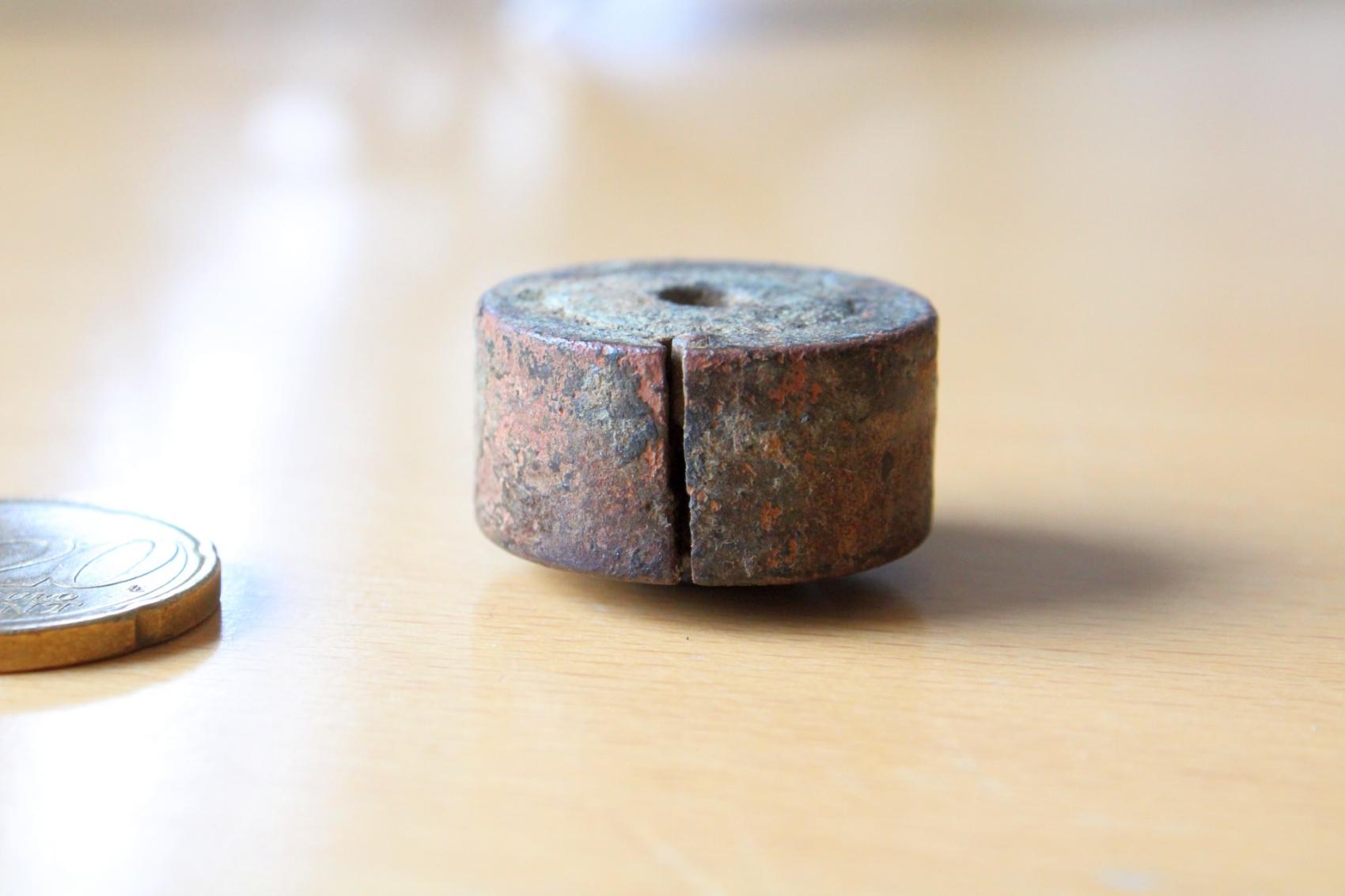 Das Teil ist nicht magnetisch, auch wenn es teils rostig aussieht. Die Patina/der Grünspan deutet eher auf Kupfer hin. Es ist auch dementsprechend schwer.