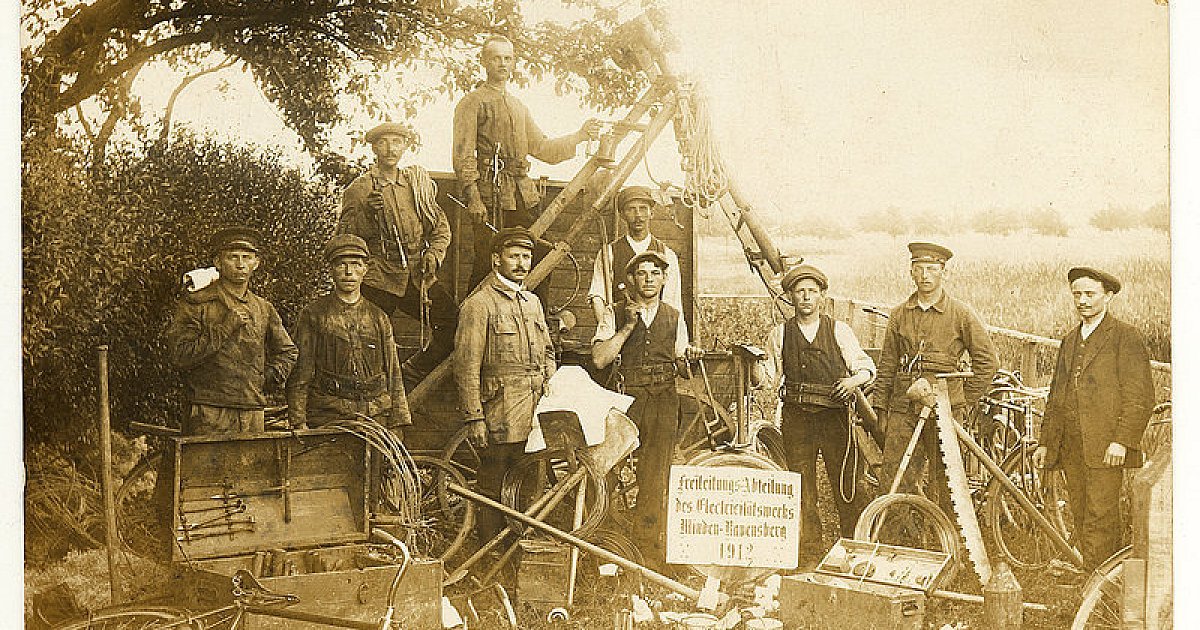 Herford. Die Männer, die hier posieren, gehörten zur handwerklichen Elite ihrer Zeit. Lässig mit einem Keramik-Isolator und Steigeisen auf der Schulter...