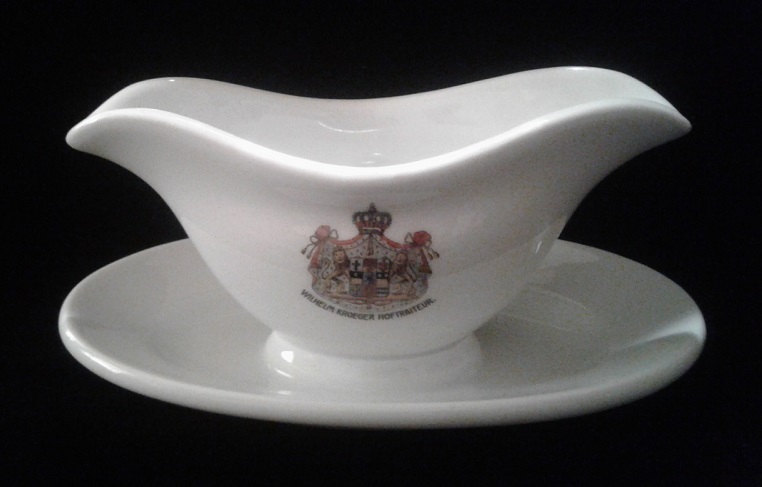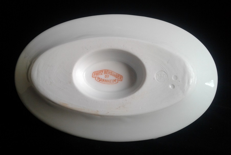 Der Prägestempel von JHR wurde von 1873-1910 verwendet.Bensinger war Dekorateur & Lieferant dieser Sauciere.