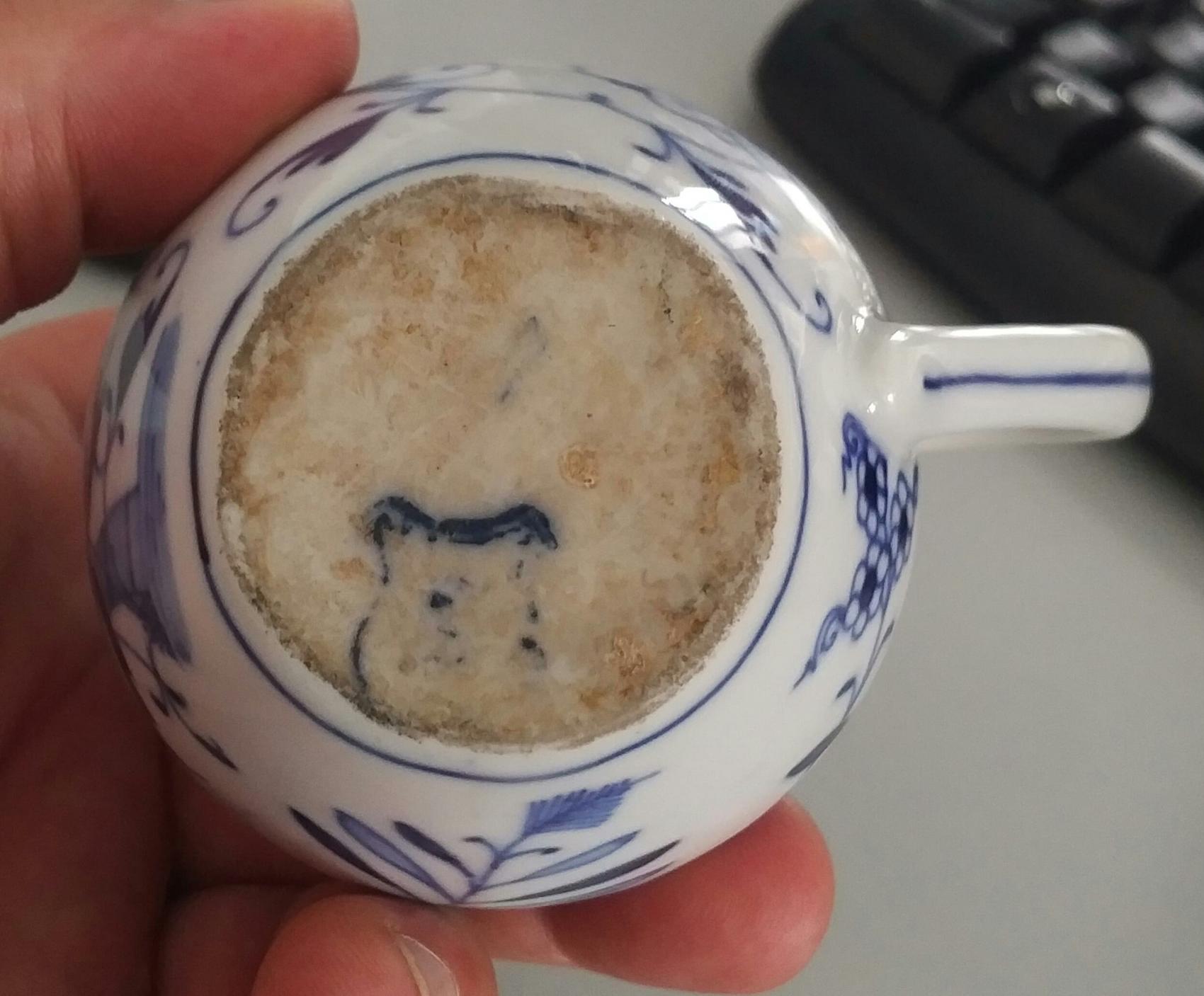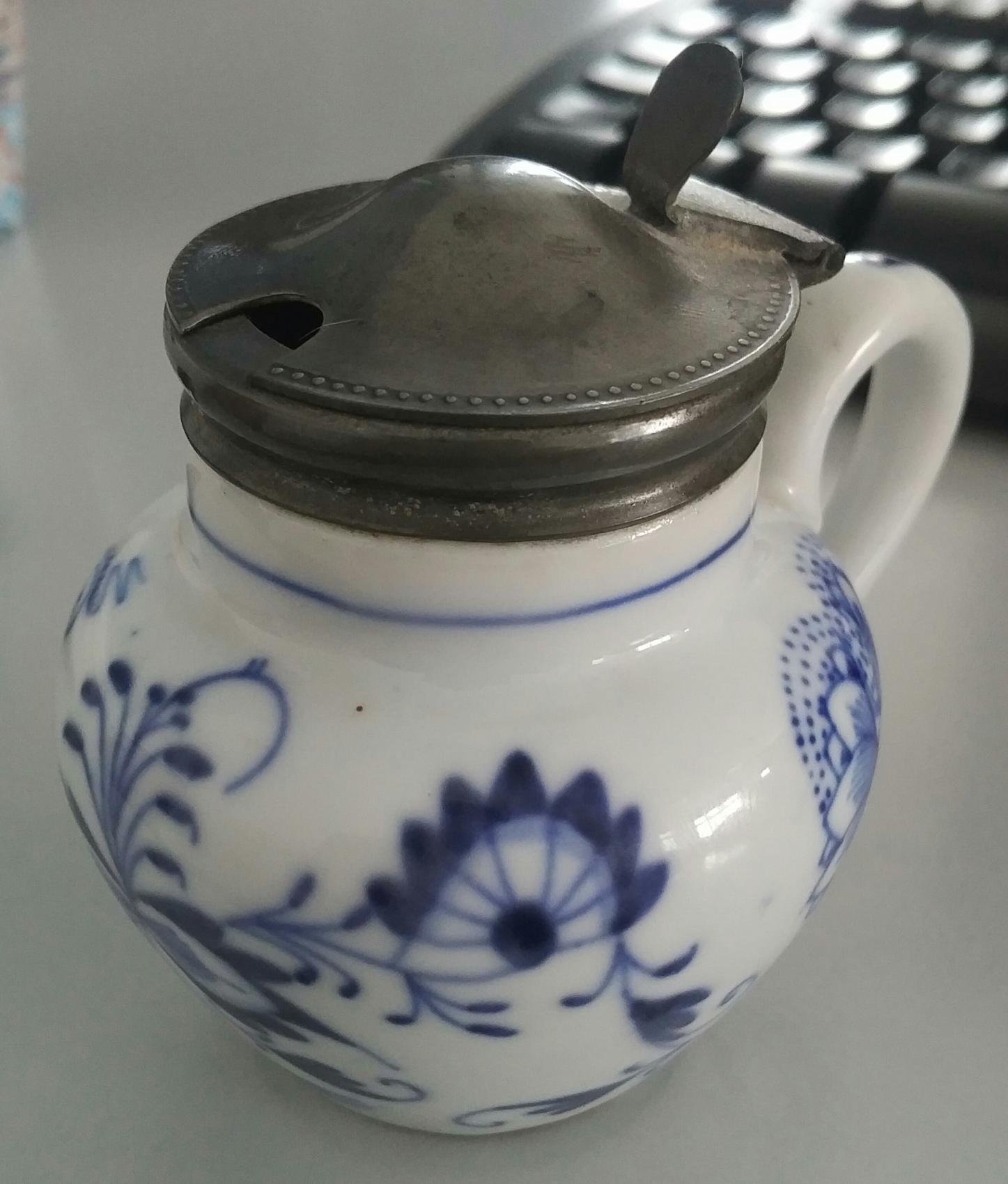 Gruesst euch. Dieses kleine Kaennchen gab's heute beim Troedler. Huebsches Zwiebelmuster,ca. 8 cm hoch mit Zinndeckelmontierung. Die Öffnung laesst mich drauf schließen das da ein Loeffel drin steckte. Leider kann ich die Marke nicht entziffern. Koennt.ihr bitte weiter helfen? Gruss Mathias