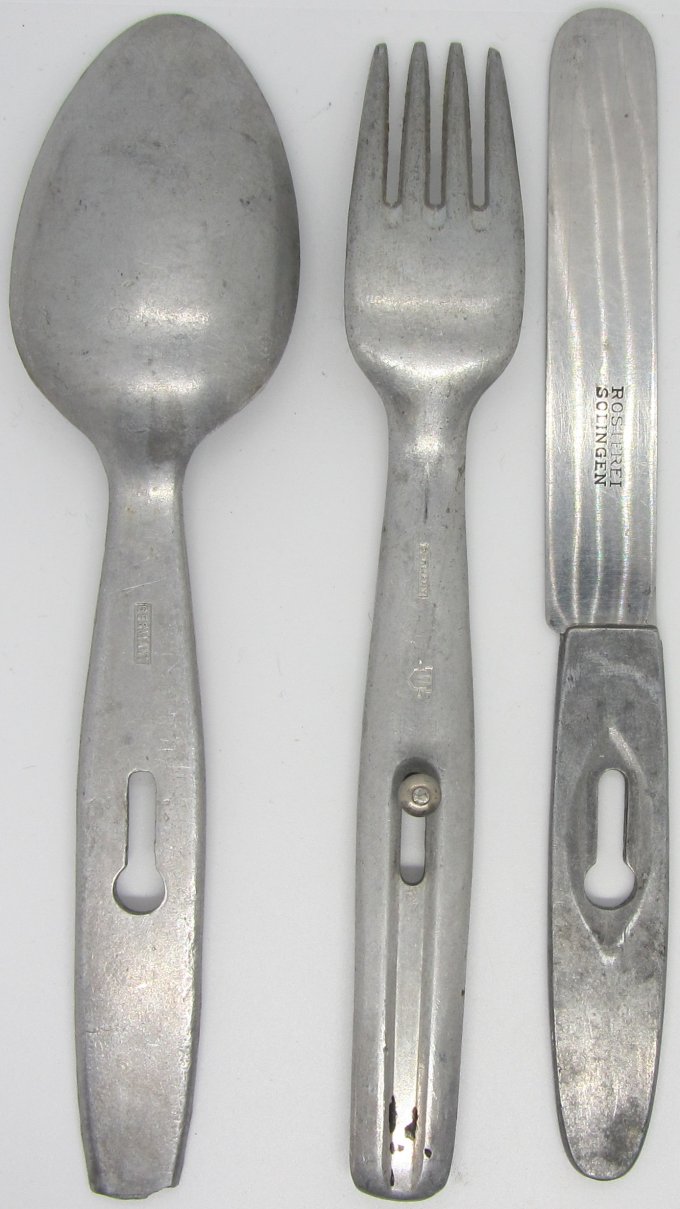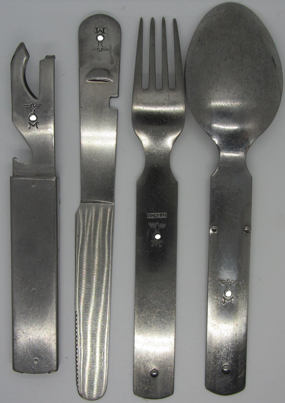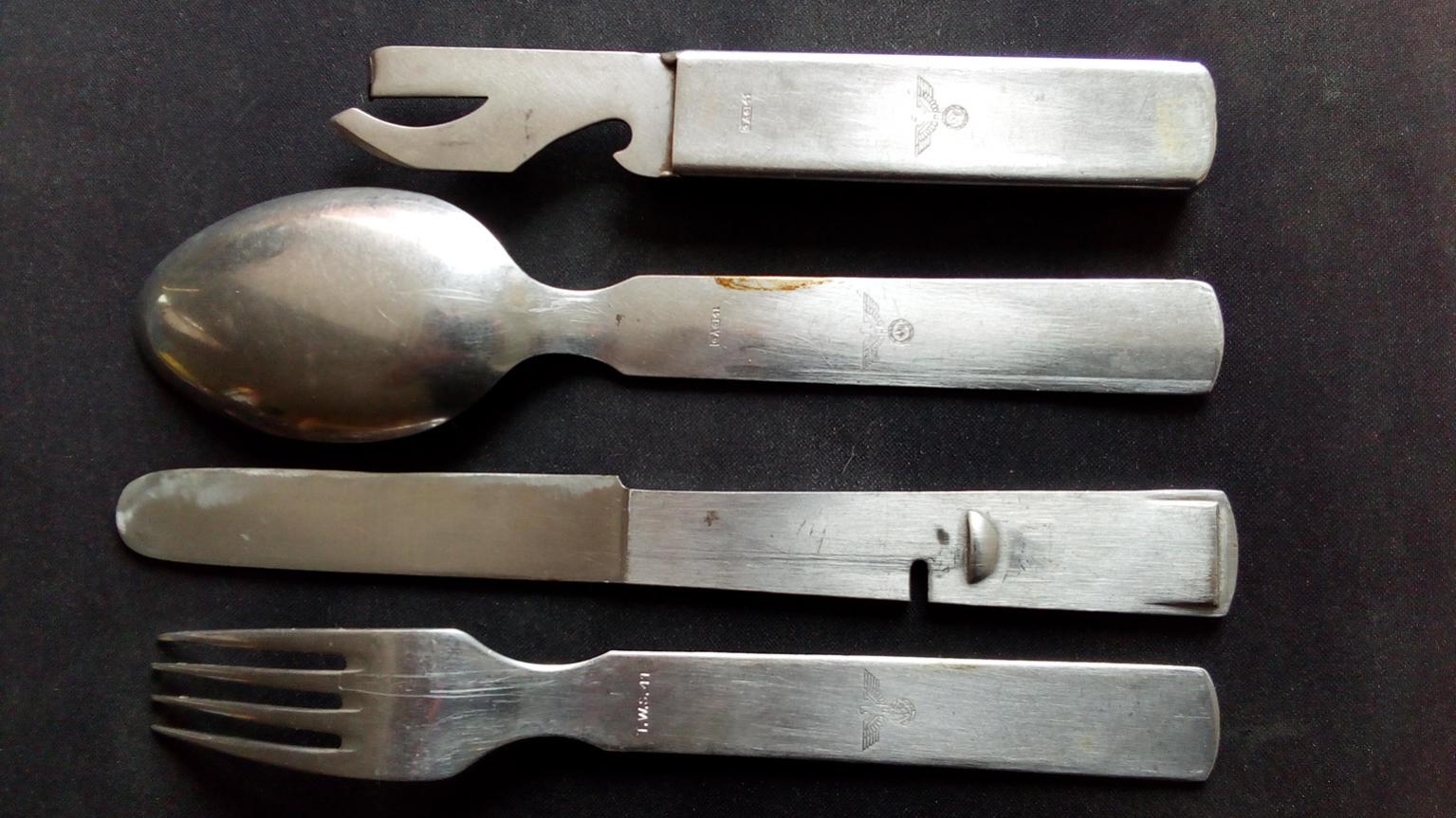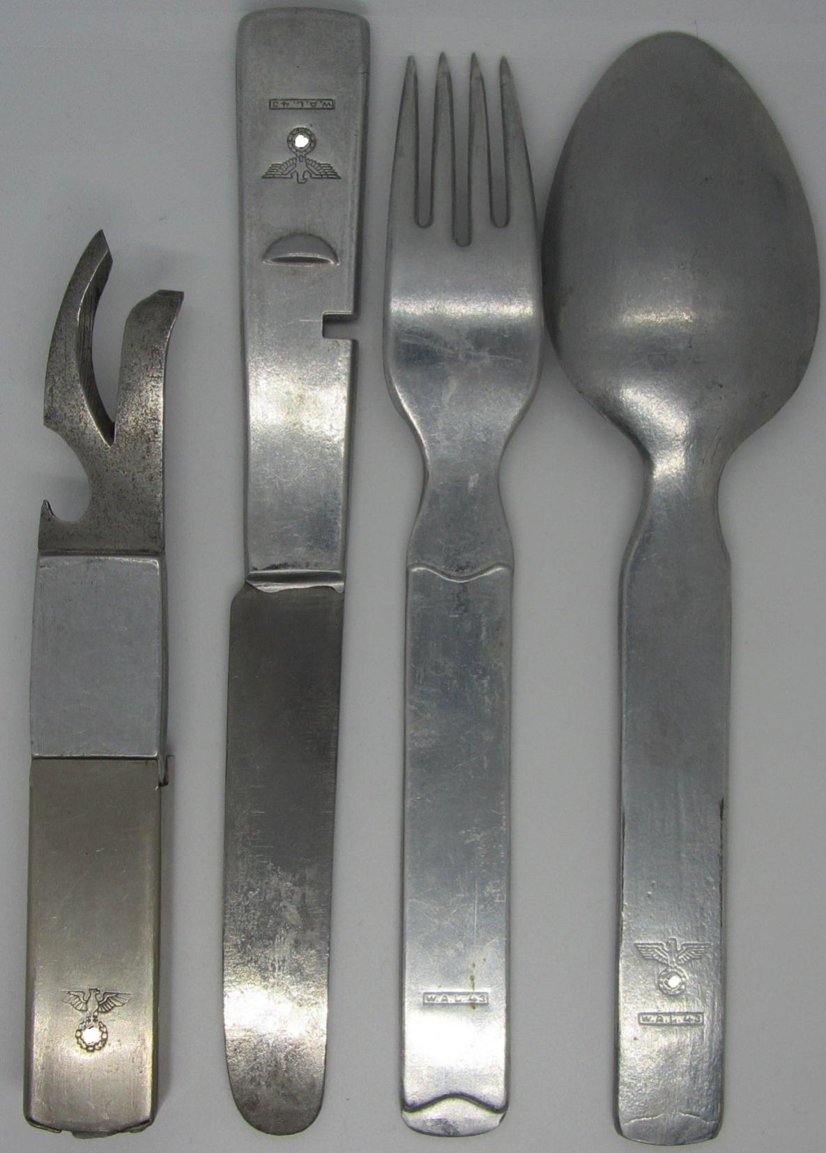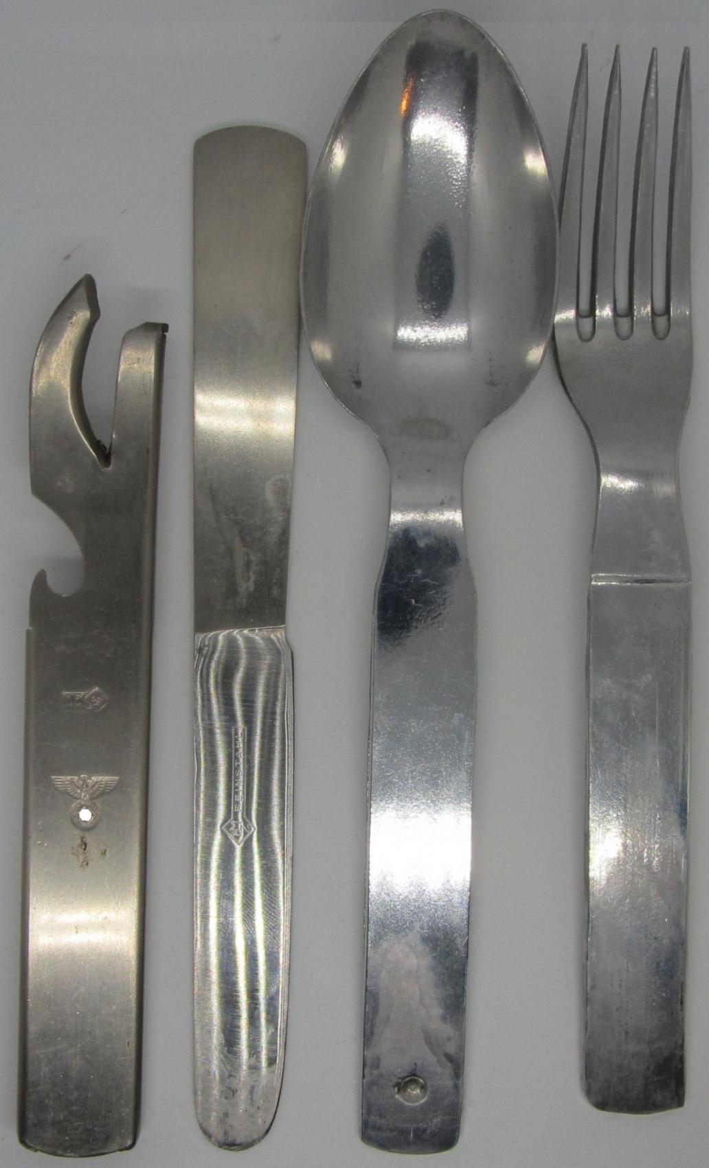 Gabel und Löffel sind aus Alu, was in der Zeit häufig der Fall war, wahrscheinlich, weil Chrom als Zuschlagstoff für die Waffenindustrie benötigt wurde. Nur Messer und Dosenöffner sind hier aus Chromstahl.