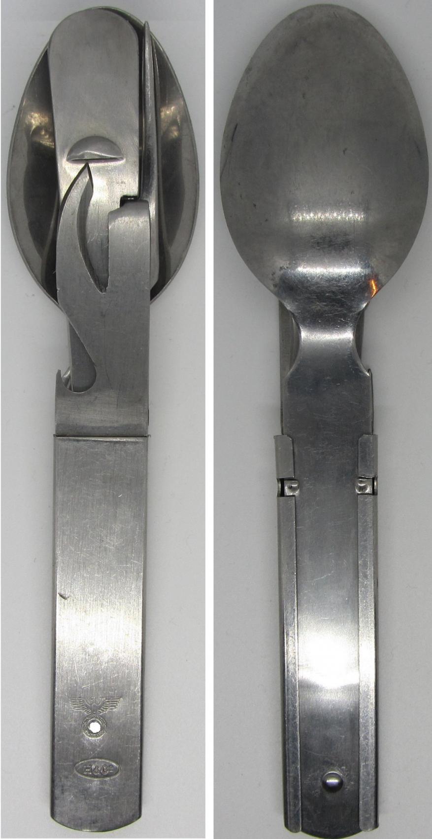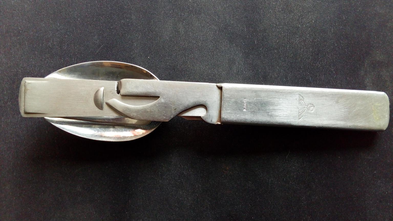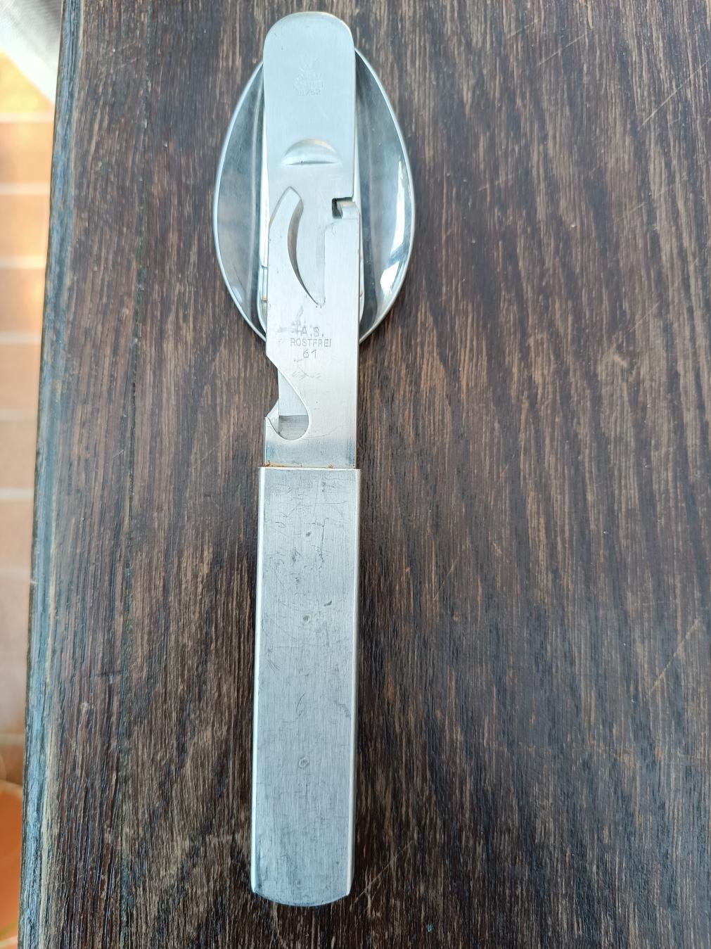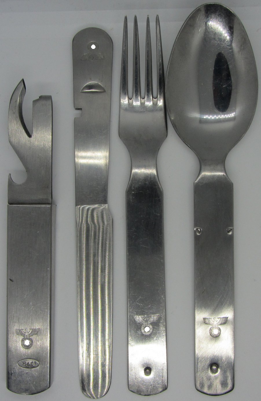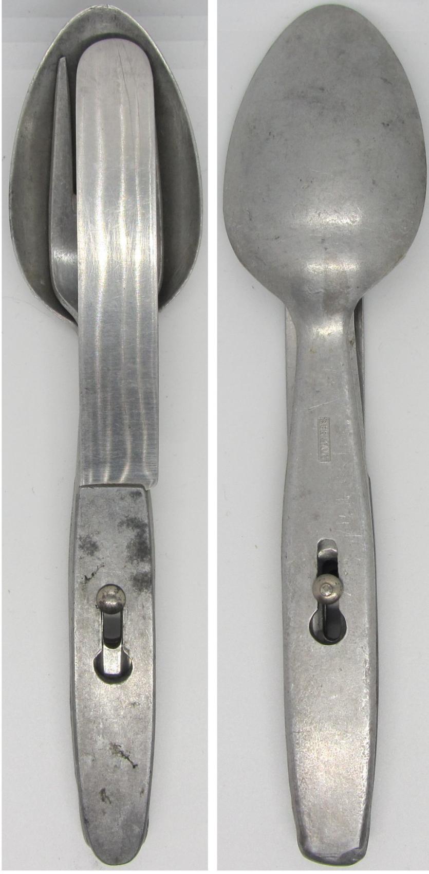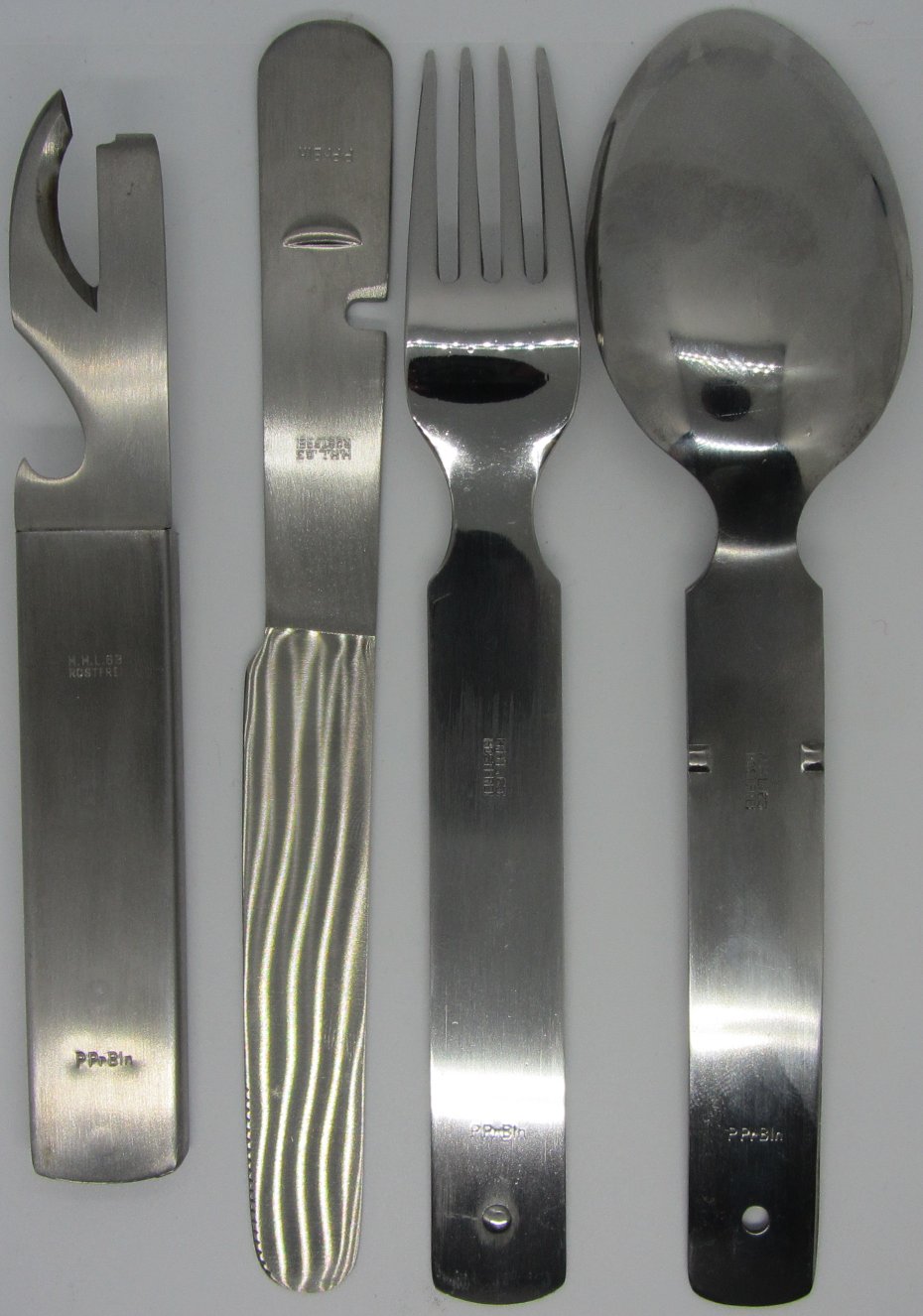 Gabel und Löffel sind aus Alu, was in der Zeit häufig der Fall war, wahrscheinlich, weil Chrom als Zuschlagstoff für die Waffenindustrie benötigt wurde. Nur Messer und Dosenöffner sind hier aus Chromstahl.