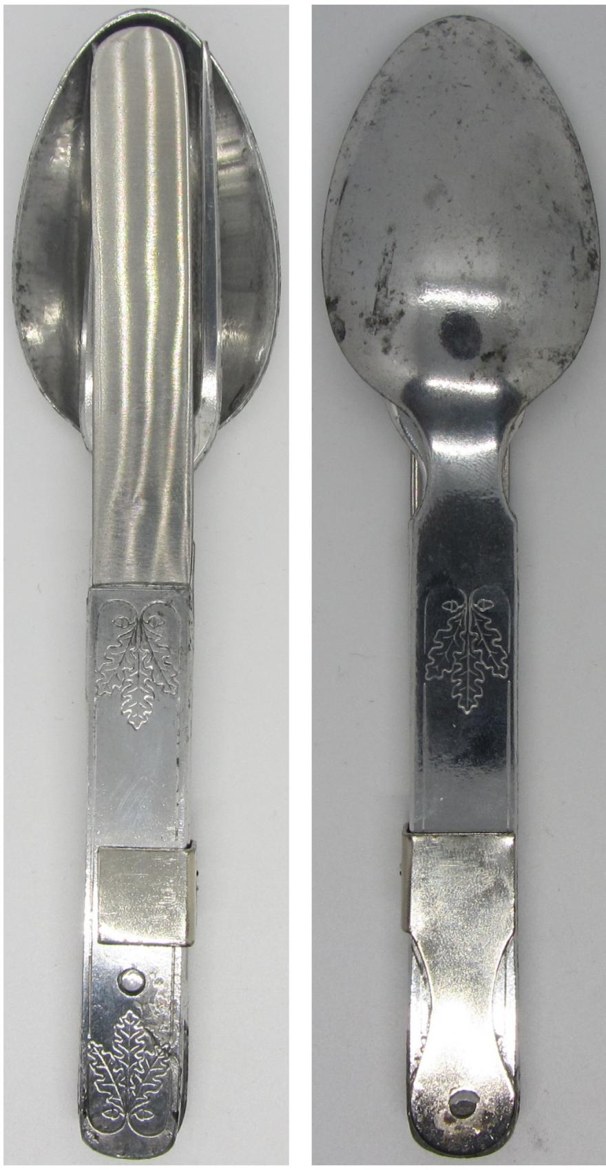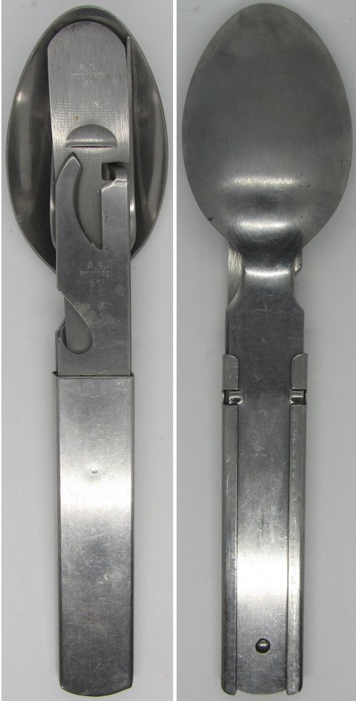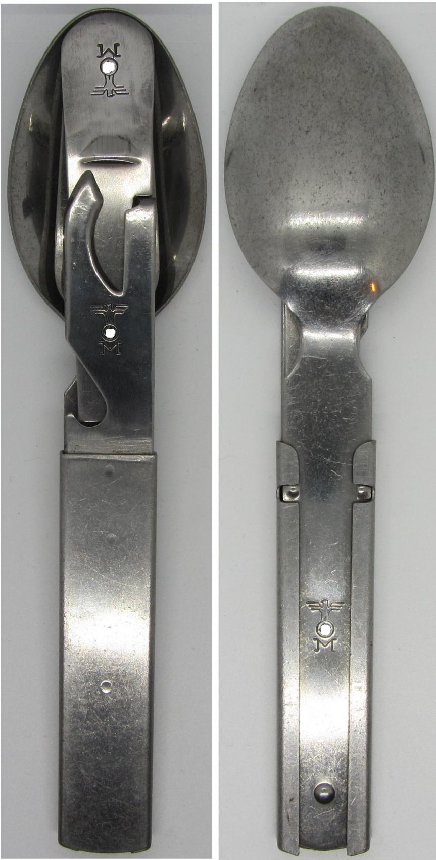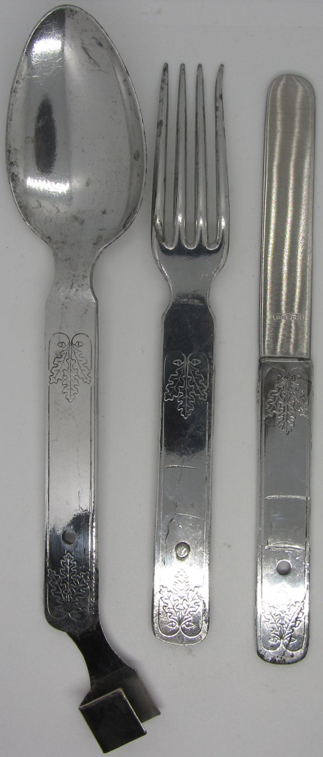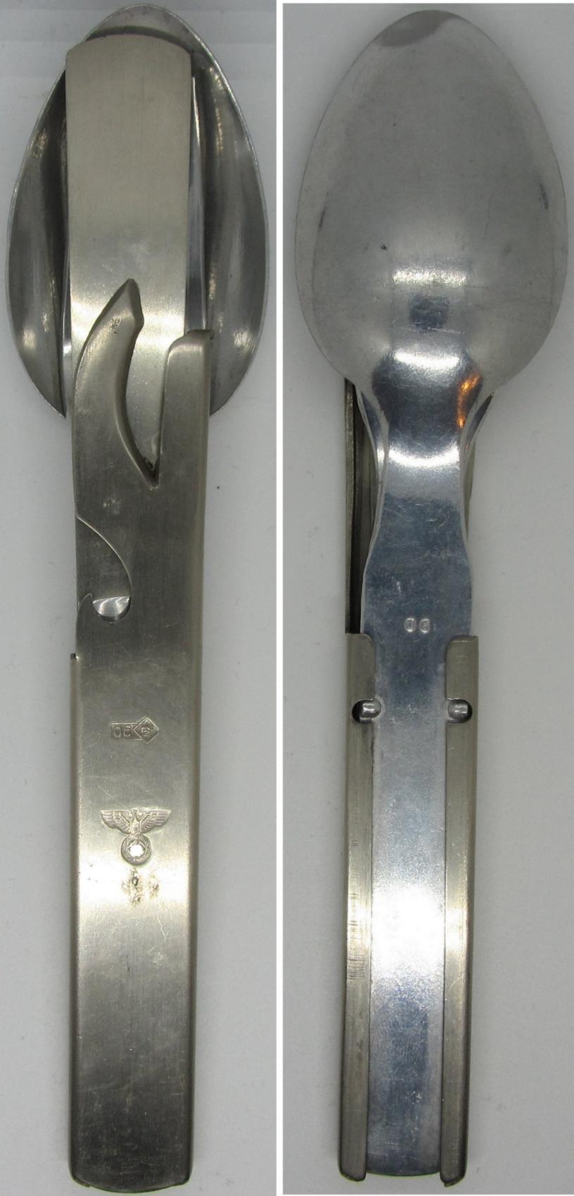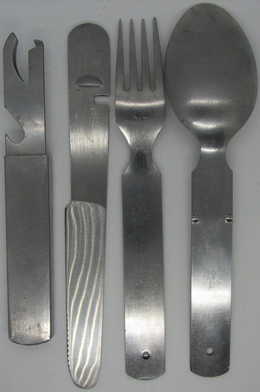 Gabel und Löffel sind aus Alu, was in der Zeit häufig der Fall war, wahrscheinlich, weil Chrom als Zuschlagstoff für die Waffenindustrie benötigt wurde. Nur Messer und Dosenöffner sind hier aus Chromstahl.