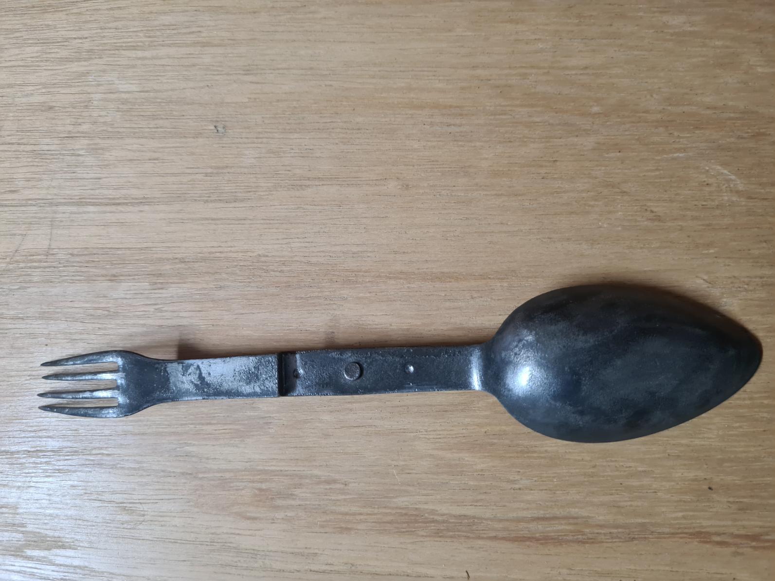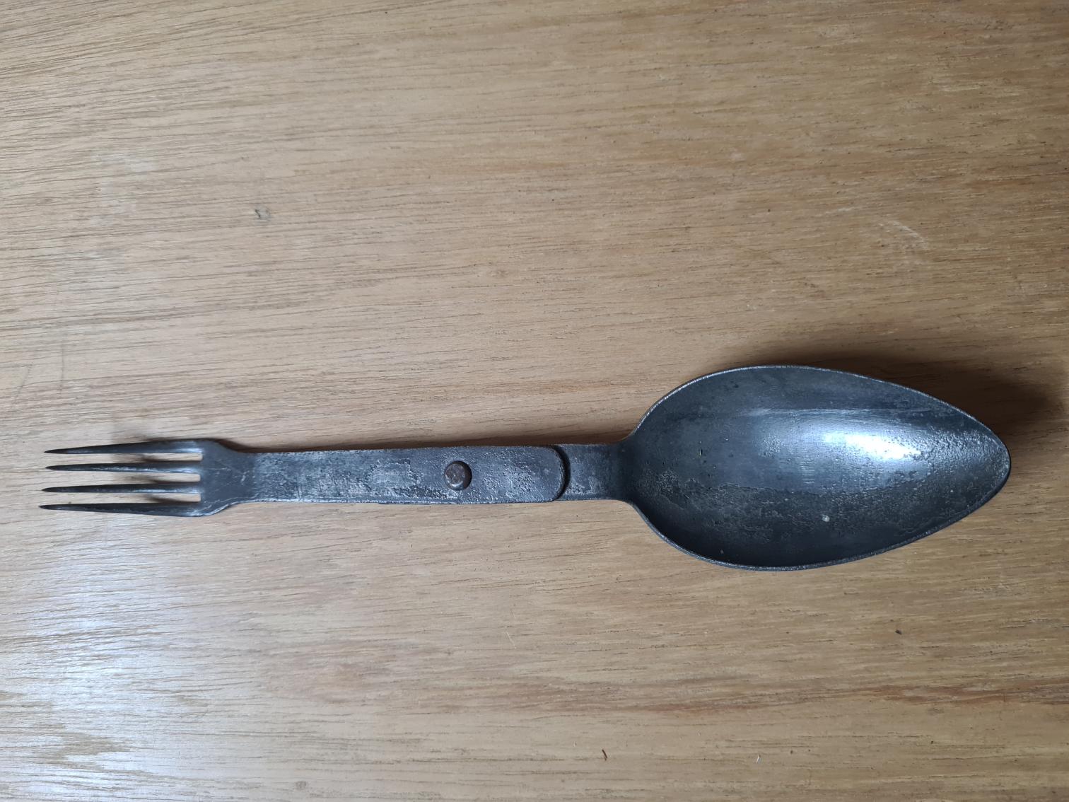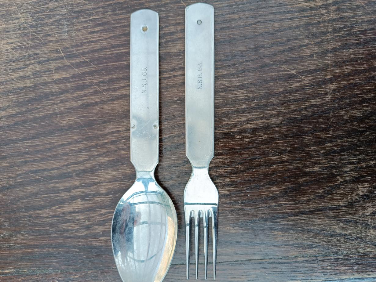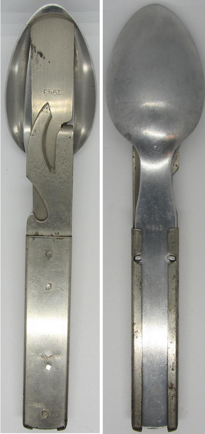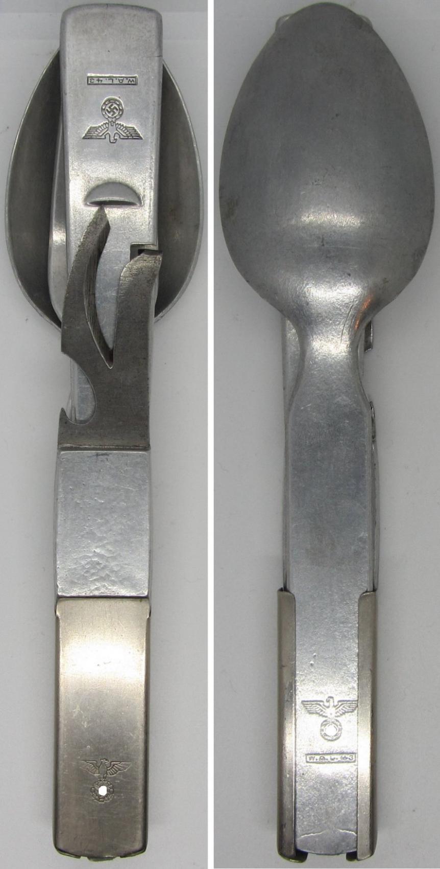 Gabel und Löffel sind aus Alu, was in der Zeit häufig der Fall war, wahrscheinlich, weil Chrom als Zuschlagstoff für die Waffenindustrie benötigt wurde. Nur Messer und Dosenöffner sind hier aus Chromstahl.