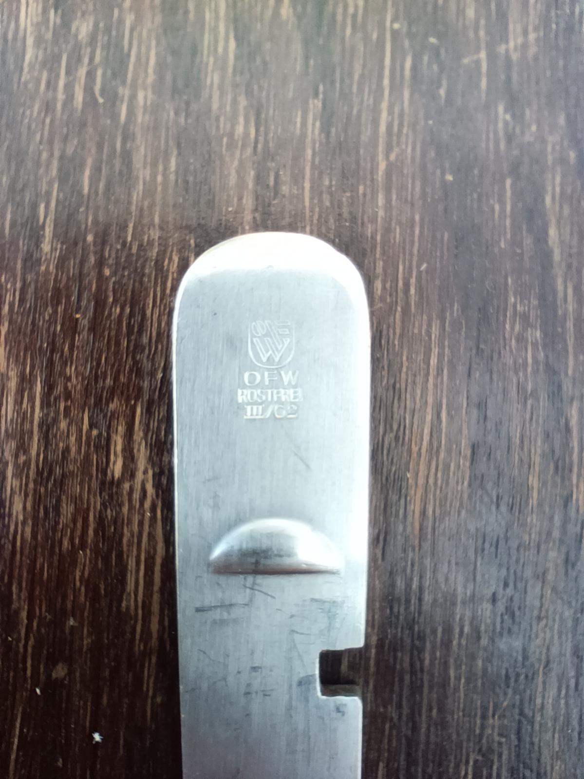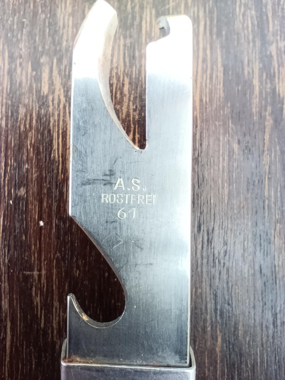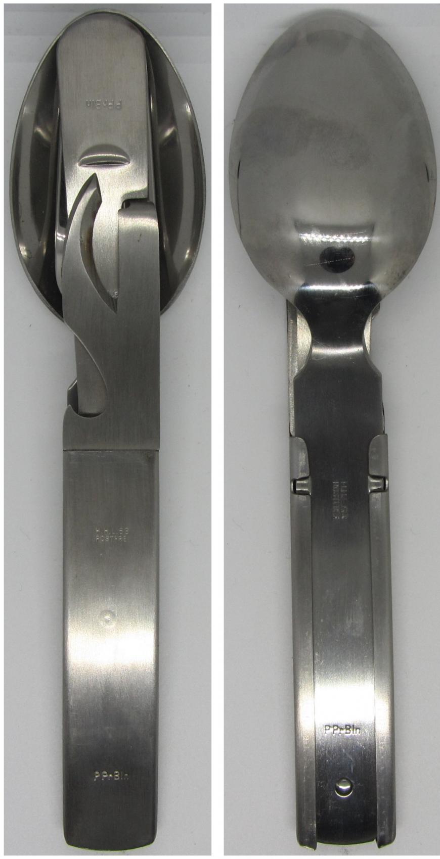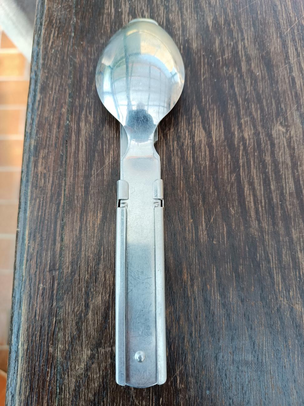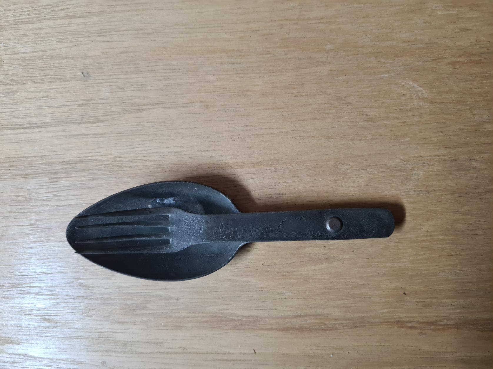 Gabel und Löffel sind aus Alu, was in der Zeit häufig der Fall war, wahrscheinlich, weil Chrom als Zuschlagstoff für die Waffenindustrie benötigt wurde. Nur Messer und Dosenöffner sind hier aus Chromstahl.