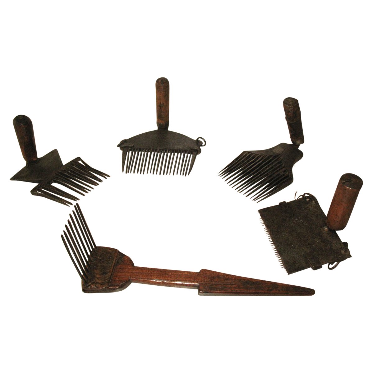 Sammlung von 5 Kardekämmen aus Schmiedeeisen und Holz aus dem 18. Jahrhundert Sie sind alle unterschiedlich Diese Werkzeuge könnten auch zum Entwirren von Hanf zur Herstellung von Seilen verwendet werden