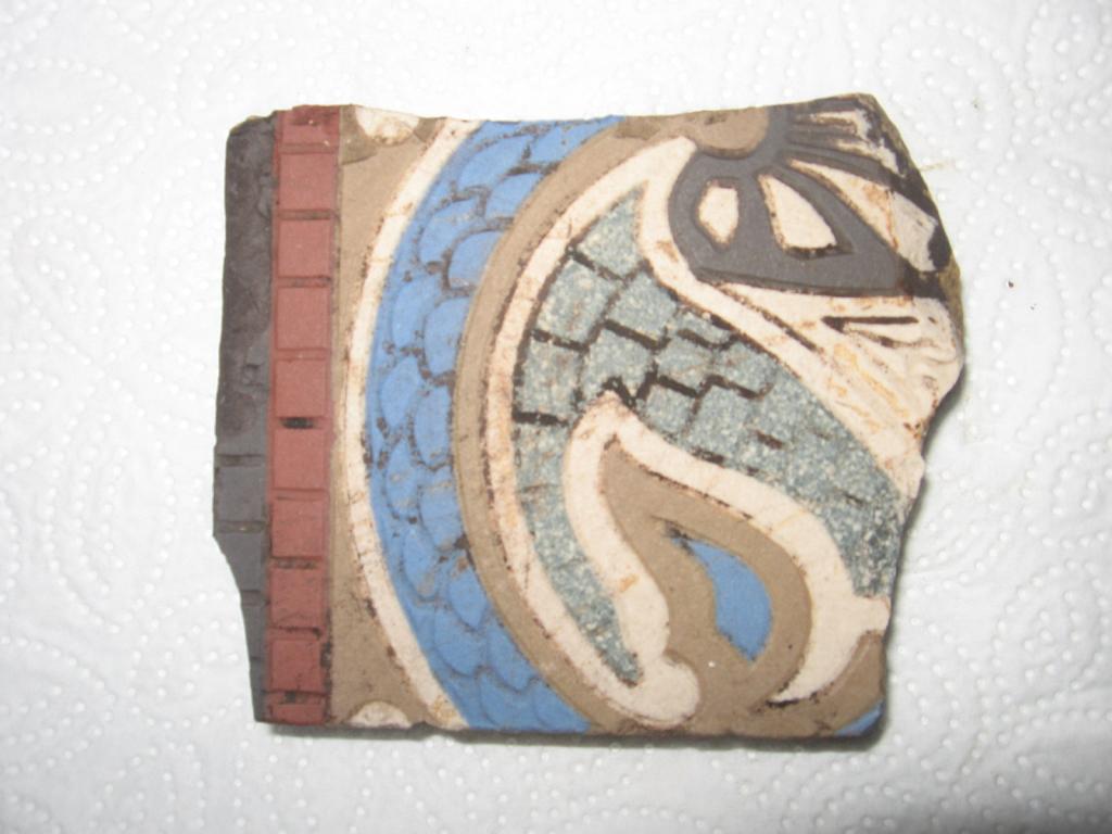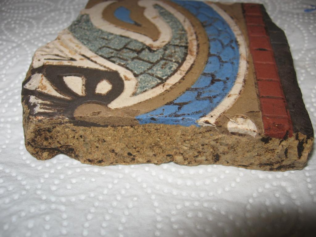 Die farbigen Ornamente sind wohl nicht ganz durchgefärbt, als ob man farbigen Lehm (oder Ton) auf eine Schamottplatte aufgebracht und dann gebrannt hätte.