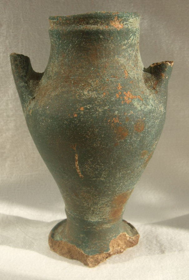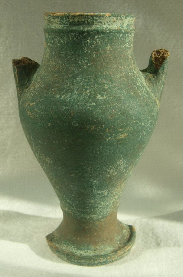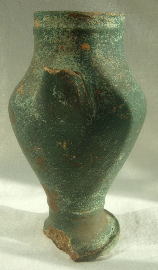 Keramik mit interessanter grüner Farbstaffierung.Höhe 10,5 cm,maximaler Durchmesser 5,8 cm.Keine Markung.
