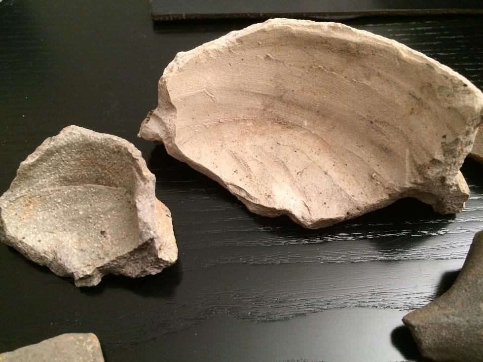 Die beiden Böden sind rheinische Wellenfüße, die natürlich auch in anderen Gegenden produziert wurde. Der kleine sieht nach Protosteinzeug aus, und passt damit ganz gut ins 14.Jhd. Der Große ist etwas später, scheinbar echtes Steinzeug mit Salzglasur zu sein - spätes 15.Jhd bis frühes 16. Jhd.