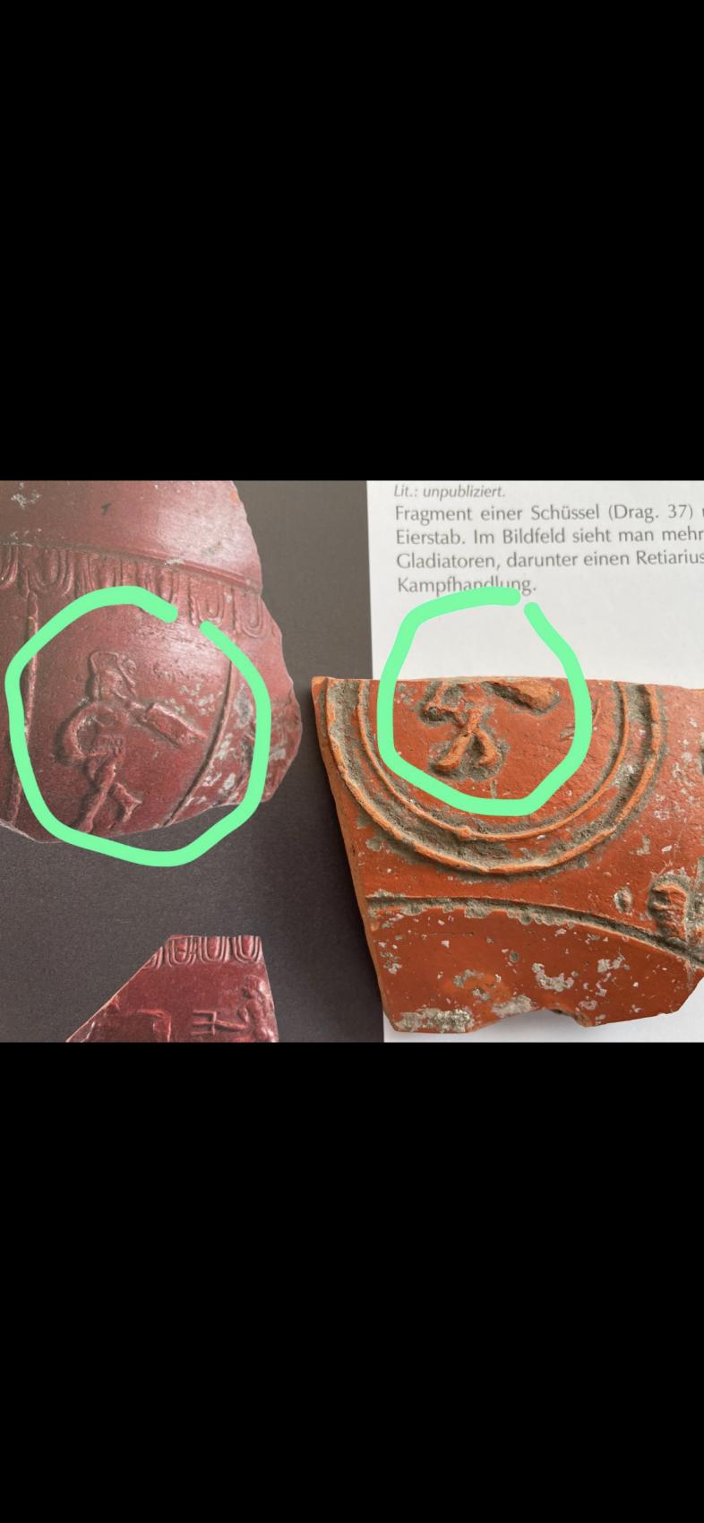 Ein netter Fund, welcher anhand von Fachliteratur eindeutig als heimische Reproduktion zu deuten ist. Stellt einen Gladiator mit Schild und Schwert/Messer da. Ohne die Fachliteratur wäre es schwer identifizierbar gewesen…. Links ein Beispiel aus klassisch römischer Produkt - sehr hochwertig gearbeitet und rechts mein Fund welcher klar eine Kopie zeigt, die mit großer Wahrscheinlichkeit heimisch ausgearbeitet wurde wo sie nicht über eine solch hochwertige Produktion mit den heimischen Kenntnissen verfügten…