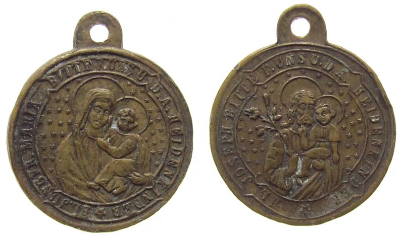 Drauf steht (Abgekürzt) "Heilige/r Maria/Joseph bitt für uns und die armen Heidenkinder"